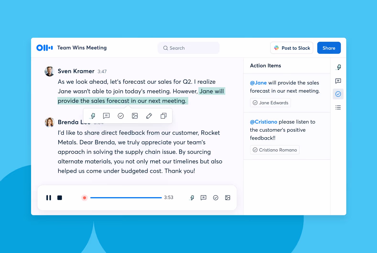 Teammates can highlight key takeaways to reference anytime. Additionally, they can assign action items directly from Otter.