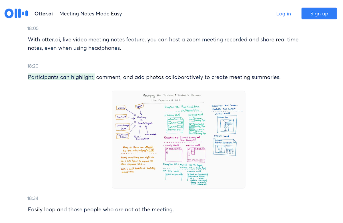Collaborators (e.g. teacher's assistants, meeting scribes) who are logged into Otter can even highlight, comment, and add photos collaboratively to create meeting notes that everyone can review and share.