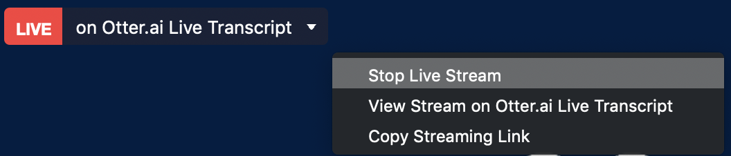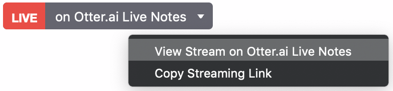 2. Click the red LIVE indicator and click View Stream on Otter.ai Live Transcript in the dropdown.