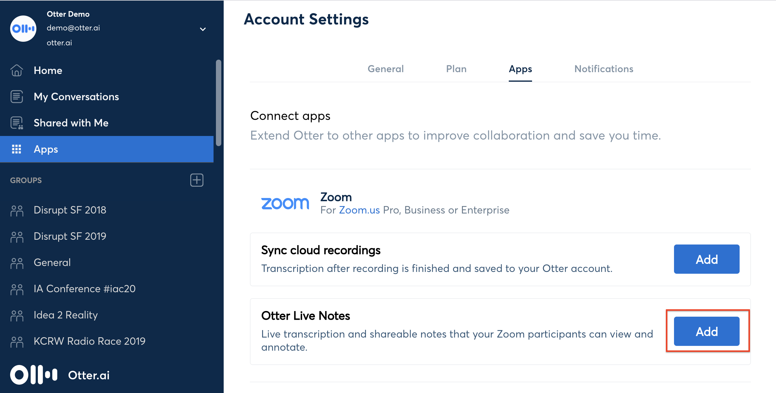 1. Log in to Otter.ai, then click Apps in the left panel.