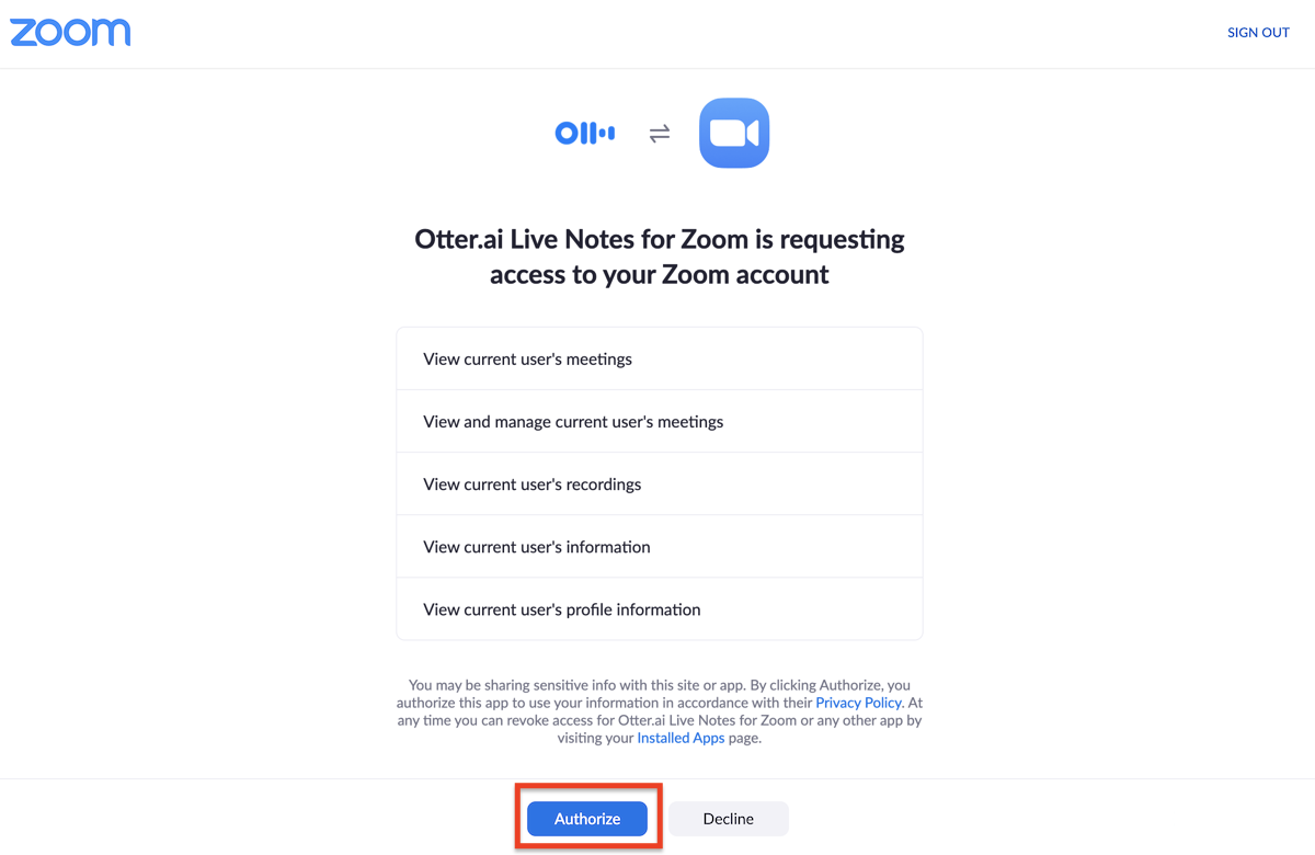 If you are unable to perform Steps 3-4, please ask your Zoom admin to perform Task 1 – Pre-approve Otter in Zoom Marketplace above.