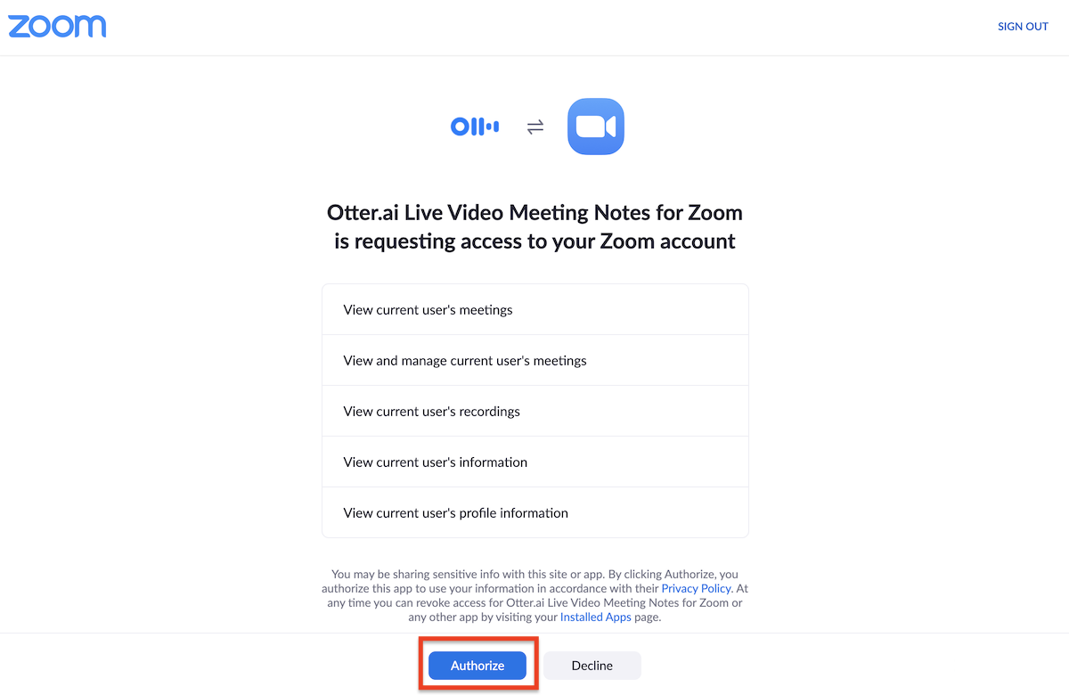 4. Click Authorize to connect Otter.ai to Zoom.