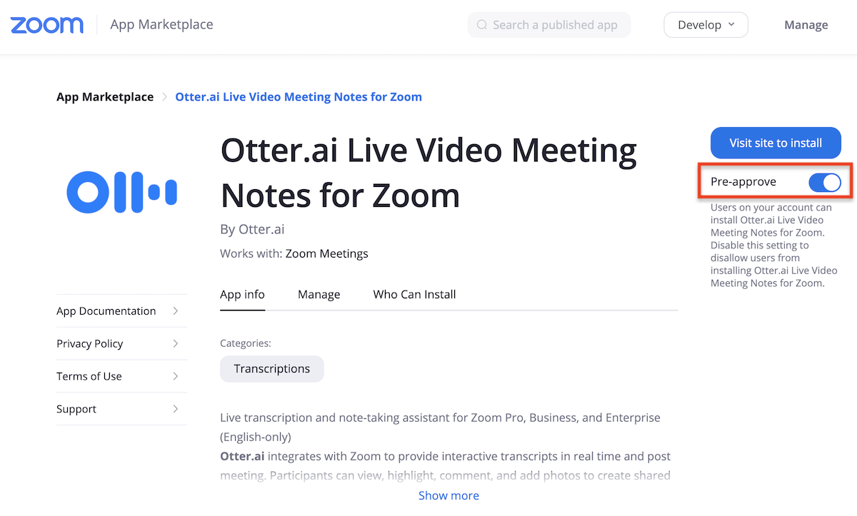 Step 1: Pre-approve Otter in the Zoom Marketplace