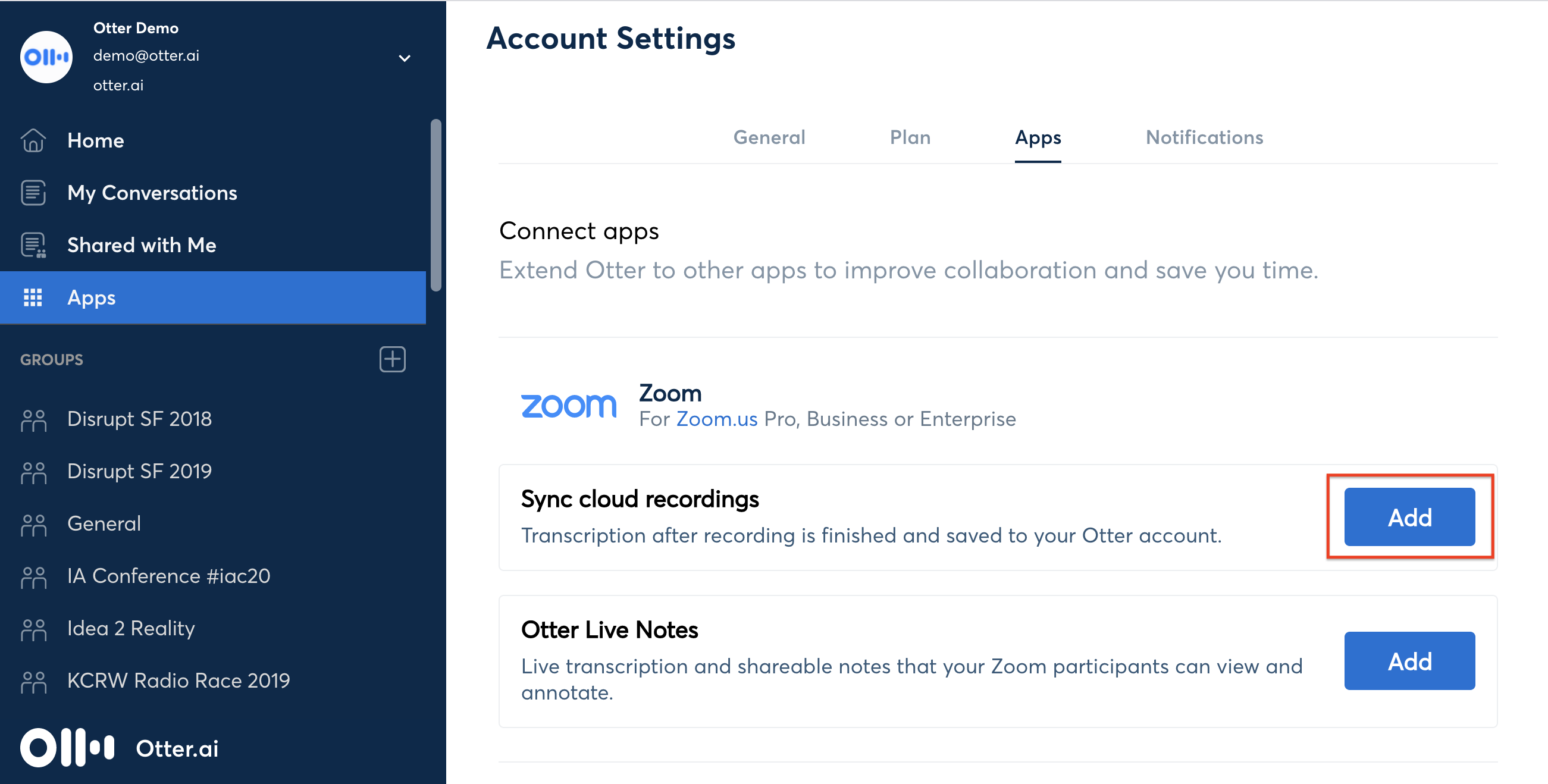1. Log in to Otter.ai, then click Apps in the left panel.