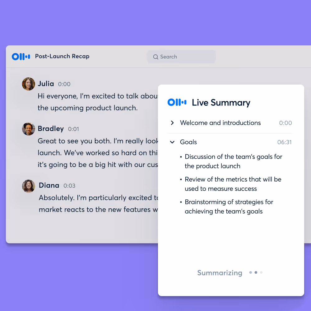 If you miss any part of the meeting, no worries. During the meeting, Otter generates a summary in real time, allowing you to easily catch up on anything you missed. After the meeting, Otter will email the summary, saving you time from having to review the entire transcript.