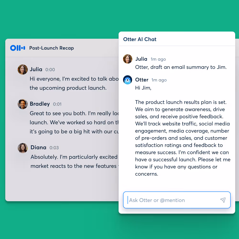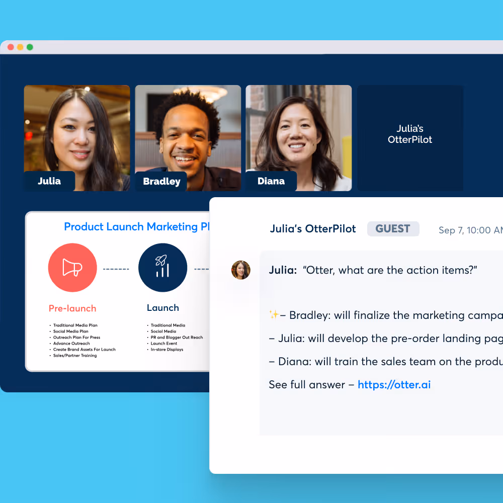 Ask questions about any discussion points or key decisions, and Otter will answer instantly. Teammates can also ask Otter to answer follow-up questions, or chat with each other without interrupting the verbal discussion.