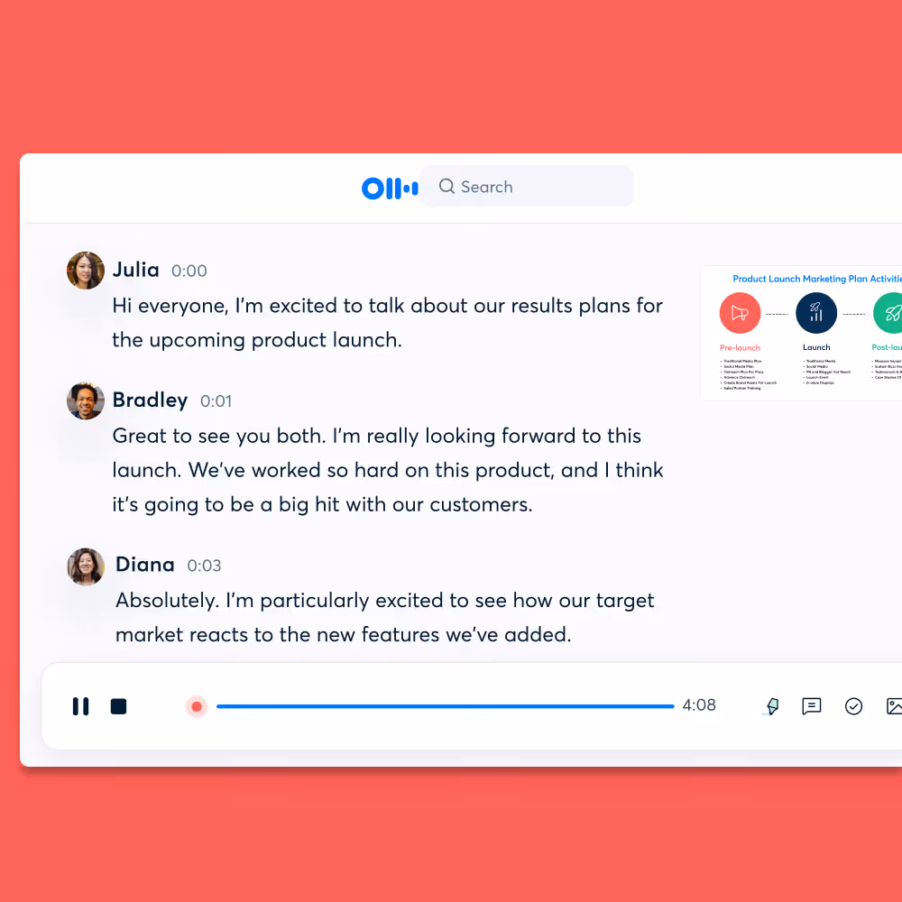 Otter writes notes in real time, so that you can focus on the discussion. You can add comments, highlight key points, and assign action items to teammates. Otter also captures slides that are shared in virtual meetings, and inserts them into the notes, providing complete context of the discussion.